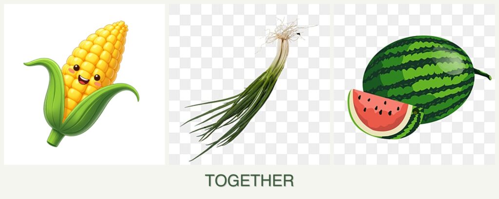 Planting corn, chives, and melons together offers several advantages: