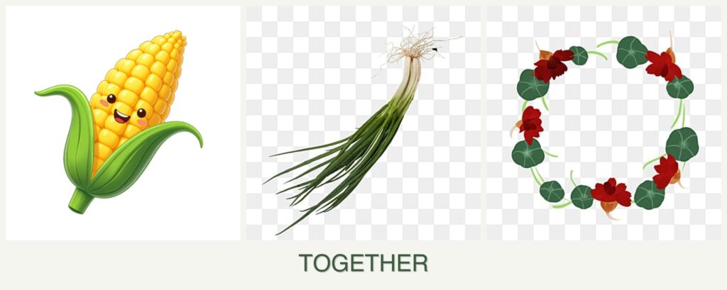 - Timing: Plant corn in spring after the last frost, followed by chives and nasturtiums.