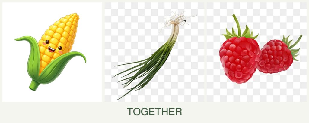 - Pest Control: Chives can repel aphids and other pests that might otherwise harm corn and raspberries.