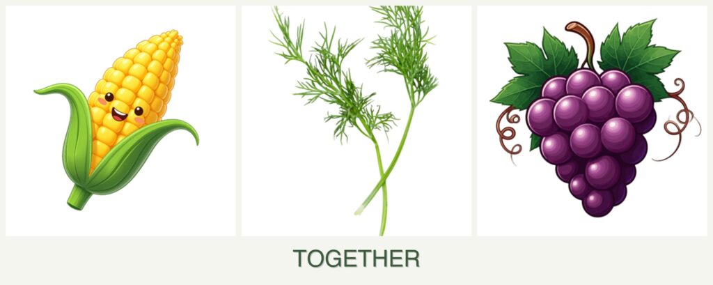 - Growth Requirements: Corn and dill both thrive in full sun and well-drained soil, but grapes prefer more specific conditions, including a trellis or support structure.