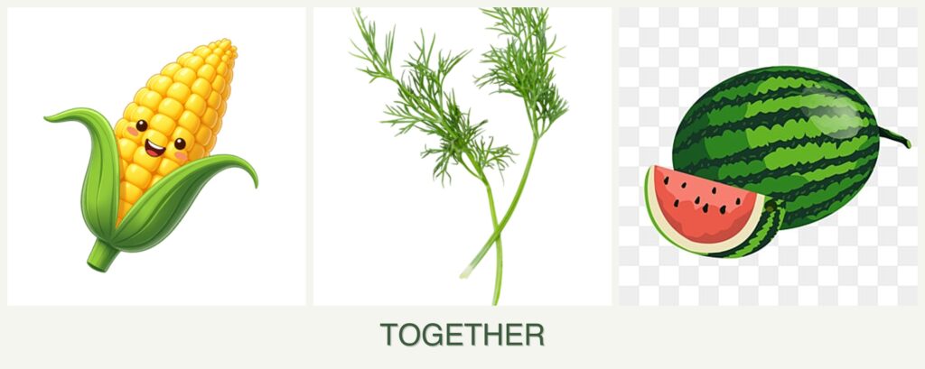 - Different Watering Needs: Melons require more water than corn and dill, so adjust irrigation accordingly.