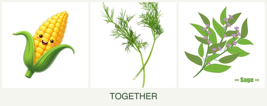 - Growth Requirements: Corn and dill thrive in similar soil and moisture conditions, whereas sage prefers drier, less fertile environments.