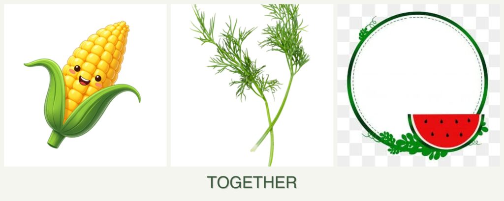 - Growth Requirements: Corn and watermelons both thrive in warm, sunny conditions, while dill can adapt to partial shade.