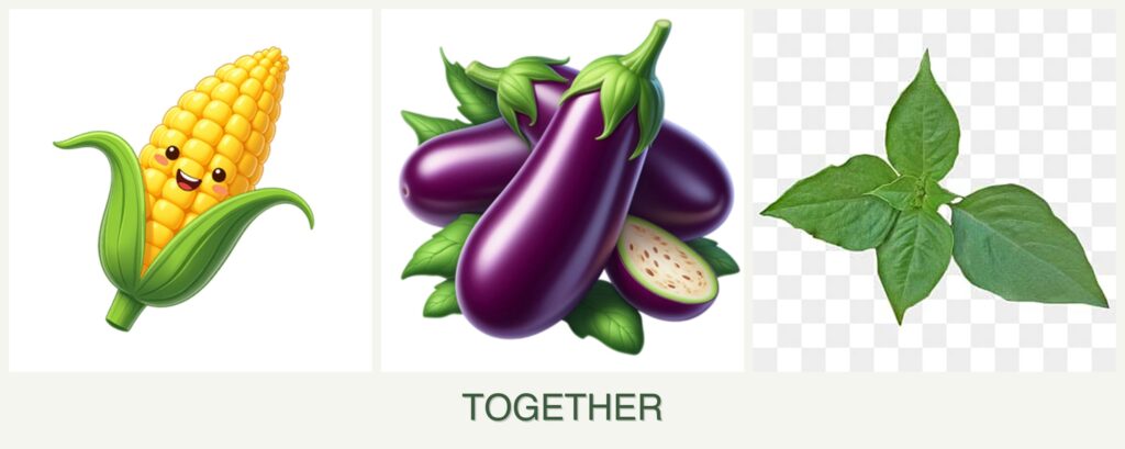- Growth Requirements: Corn and eggplant both thrive in full sun and warm temperatures, while basil can tolerate some shade provided by corn.