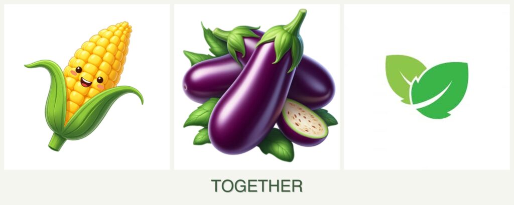 Companion planting can help manage pests: corn can attract beneficial insects, while mint’s strong aroma repels some pests. Eggplant benefits from the shade and protection provided by corn, reducing sunscald and pest issues.