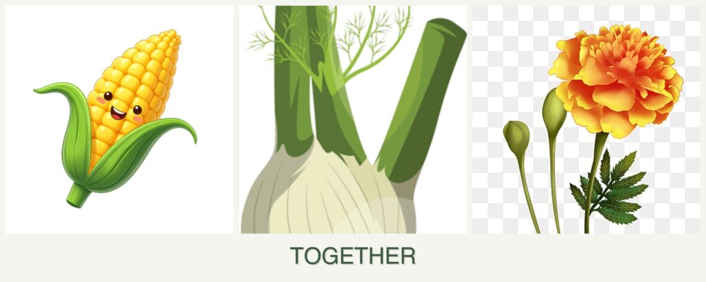 Different Watering Needs: While corn and marigolds have similar water needs, fennel’s allelopathic nature can disrupt the growth of its neighbors.