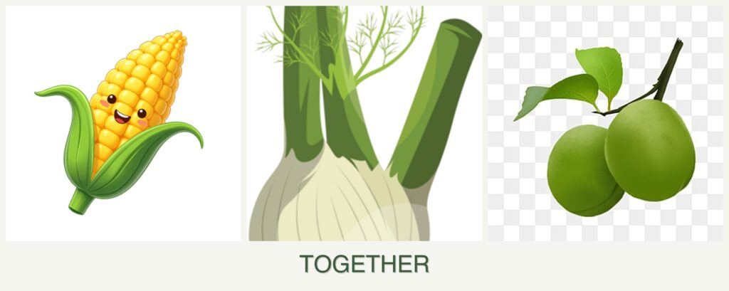 - Different Watering/Feeding Needs: Corn’s heavy feeding requirements can deplete soil nutrients needed by fennel and plums.