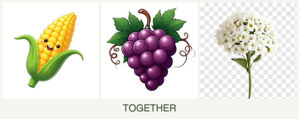 - Optimal Spacing: Plant corn in rows with grapes interspersed to allow climbing. Alyssum can be planted around the base to create a living mulch.