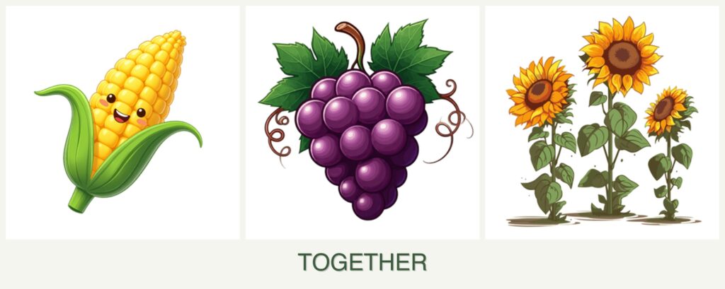 - Growth Requirements: Corn and sunflowers need full sun and rich soil, while grapes thrive in well-drained soil with good air circulation.