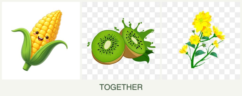 Growth Requirements: Corn is a tall, sun-loving annual that requires plenty of space and nutrients. Kiwi, a perennial vine, needs support structures and a warm climate. Calendula, a hardy annual flower, prefers cooler temperatures and can tolerate partial shade.