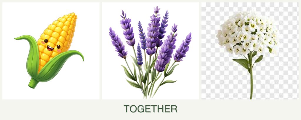 - Pollinator Attraction: Lavender and alyssum attract bees and butterflies, improving pollination for corn.