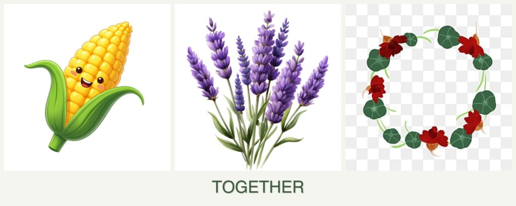 - Improved Growth: Lavender attracts pollinators, enhancing the pollination of corn, while nasturtiums improve soil health by fixing nitrogen.