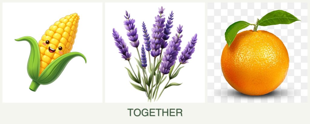 - Growth Requirements: Corn requires full sun and ample water, while lavender needs less water and thrives in full sun with well-drained soil. Oranges also need full sun but require more water than lavender.