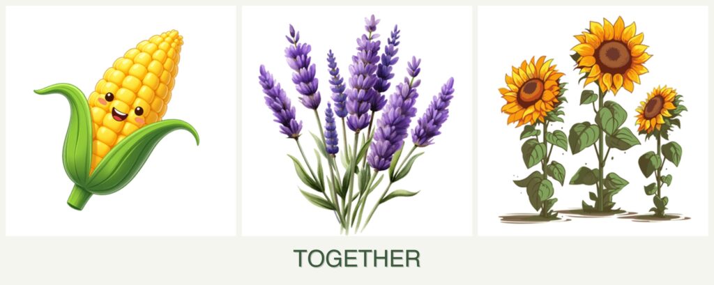 - Soil Preparation: Amend soil with compost for corn and sunflowers; ensure lavender’s soil drains well.