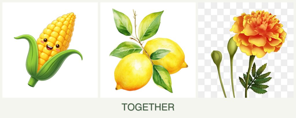 - Nutrient Needs: Corn demands nitrogen-rich soil, whereas lemons need well-balanced nutrients. Marigolds are low-maintenance but can improve soil health.