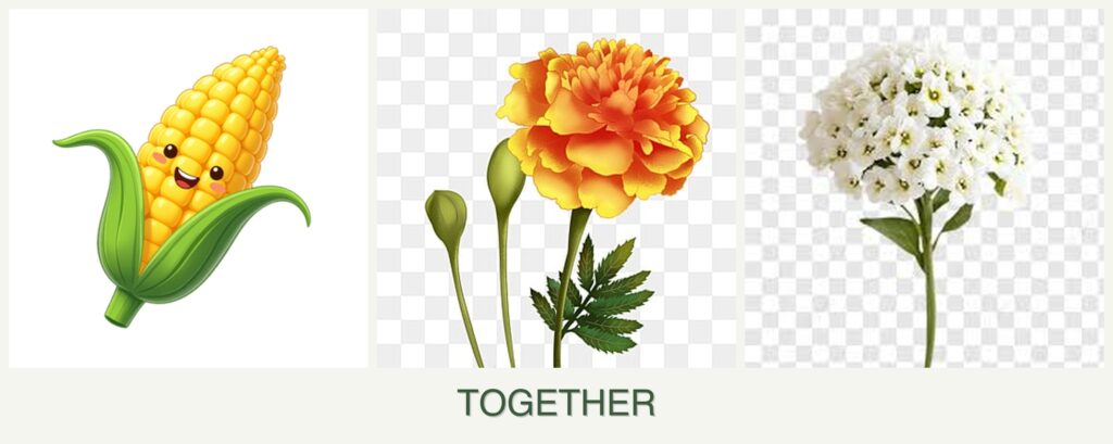 - Pest Repellent Properties: Marigolds deter nematodes and aphids, reducing pest pressure on corn and alyssum.