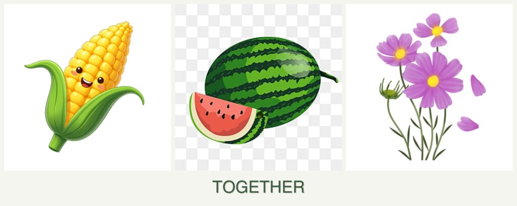 - Resource Competition: Corn’s high nutrient demand can overshadow the needs of melons and cosmos. Regular fertilization can mitigate this.
