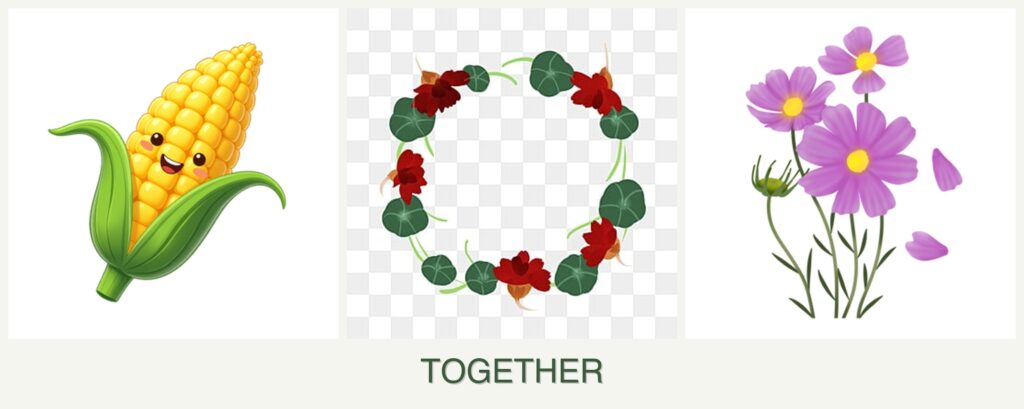 - Resource Competition: Corn’s heavy nutrient needs may outcompete nasturtiums and cosmos if not managed.