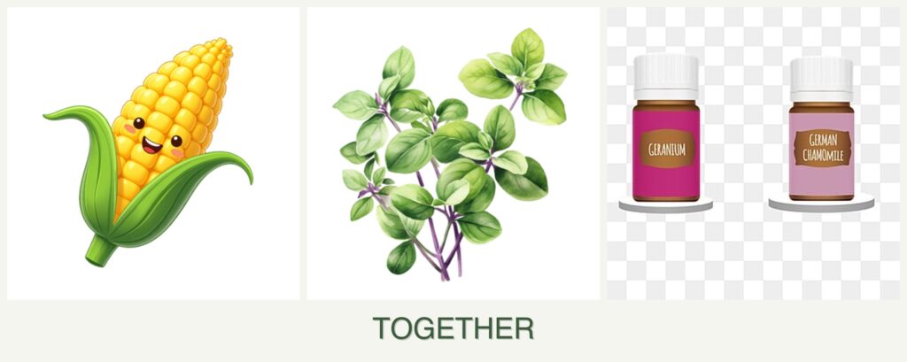 - Resource Competition: Corn’s high nutrient needs may overshadow oregano and geraniums.
