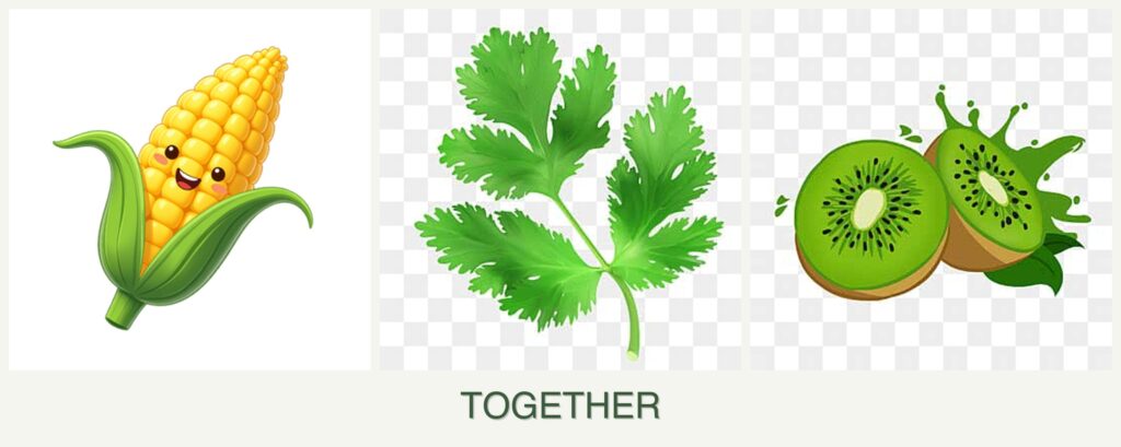 - Growth Requirements: Corn and parsley can share similar soil and water needs, but kiwi demands a more specific environment.