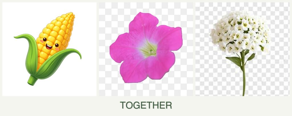 Improved Growth: Corn provides shade and wind protection for the smaller plants, while petunias and alyssum help retain soil moisture.