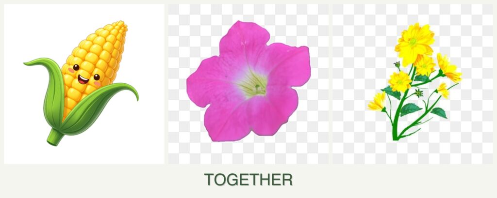 - Staggered Planting: Plant corn first, followed by petunias and calendula, to manage growth stages.