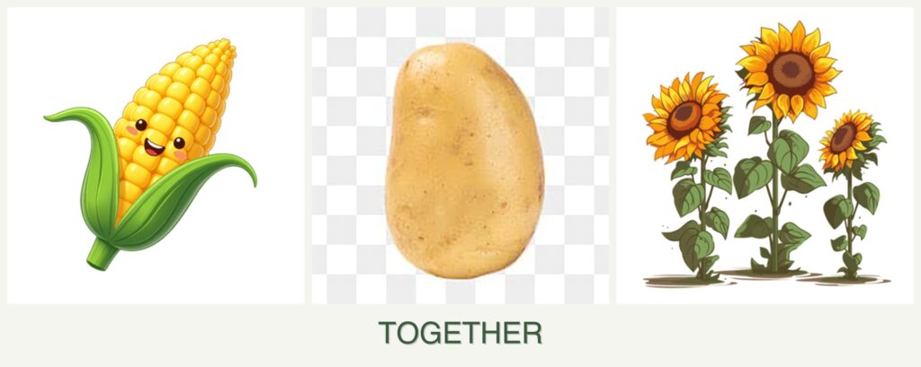 - Space Efficiency: Vertical growth of corn and sunflowers maximizes space, allowing potatoes to spread beneath.