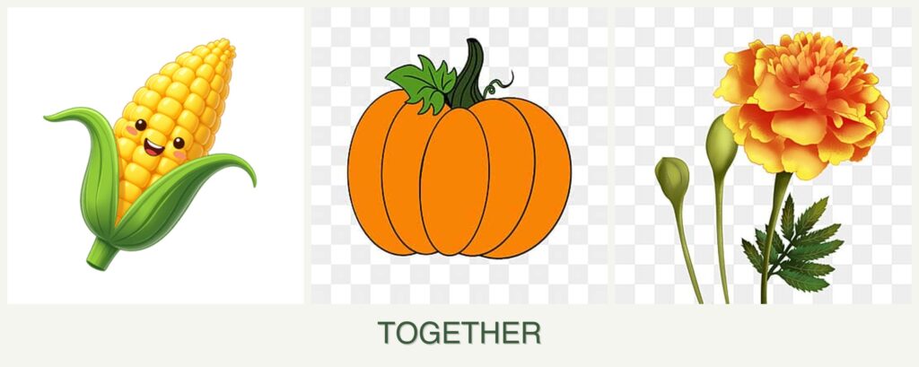 - Pest Control: Marigolds deter nematodes and other pests, benefiting both corn and pumpkin.