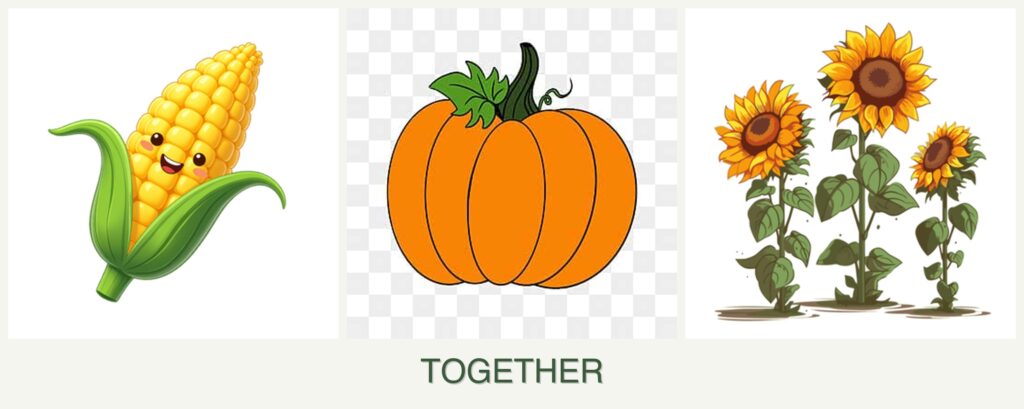 - Space Efficiency: Corn and sunflowers grow vertically, while pumpkins spread horizontally, making efficient use of space.