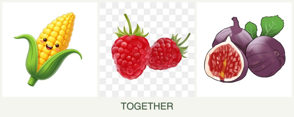 - Spacing: Corn grows tall and can overshadow raspberries and figs, affecting their access to sunlight.
