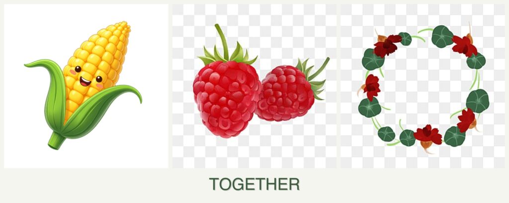 Growth Requirements: Corn thrives in full sun and requires well-drained soil. Raspberries prefer slightly acidic soil and can tolerate partial shade. Nasturtiums are versatile and can grow in poorer soils, making them excellent ground cover.