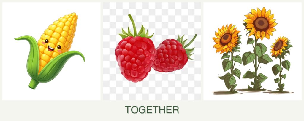 Planting these together maximizes vertical space. Corn and sunflowers grow tall, allowing raspberries to spread at ground level, optimizing garden space.