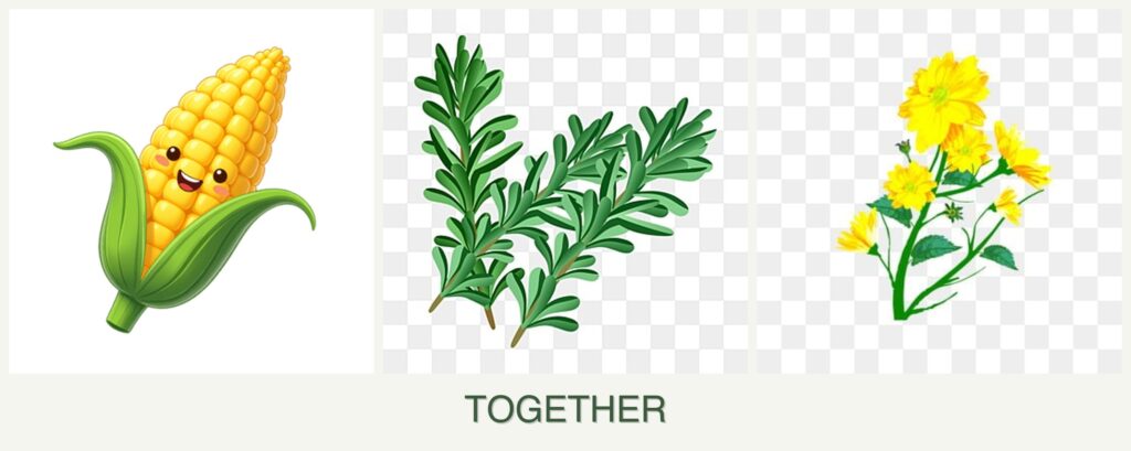 - Resource Competition: Corn’s high water and nutrient needs may deprive rosemary and calendula of essential resources.