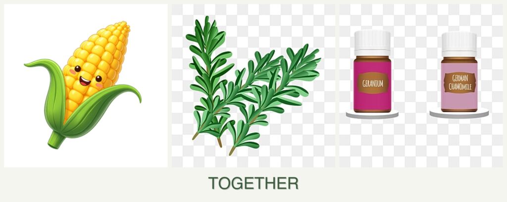 - Resource Competition: Corn’s high nutrient demands can deplete soil resources, affecting rosemary and geraniums.