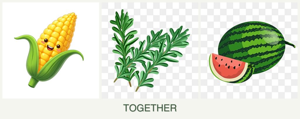- Spacing: Corn needs space to grow tall, while melons spread out, and rosemary stays compact. These differences can lead to resource competition and hinder growth.