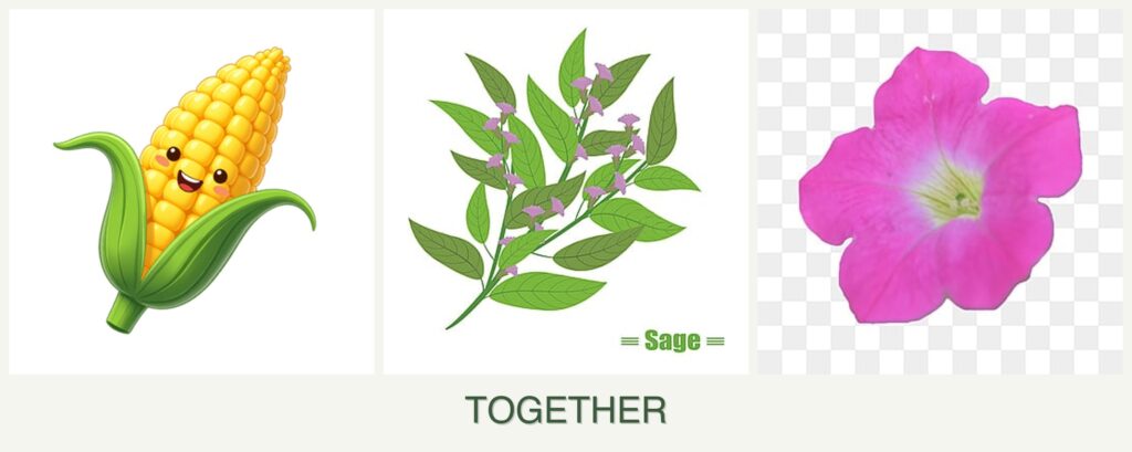 Pest Control: Sage’s aromatic leaves deter pests like cabbage moths, which can benefit corn. Petunias also repel aphids and attract beneficial insects.