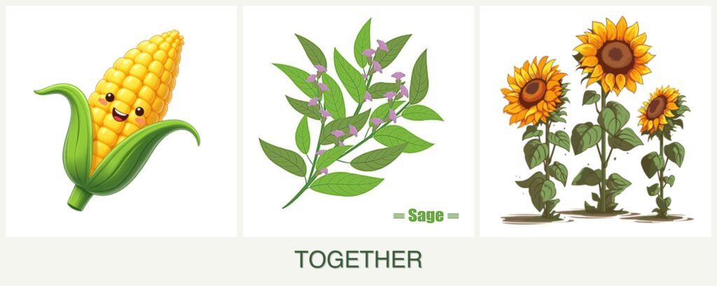 - Nutrient Needs: Corn and sunflowers are heavy feeders, while sage requires fewer nutrients, reducing competition for resources.