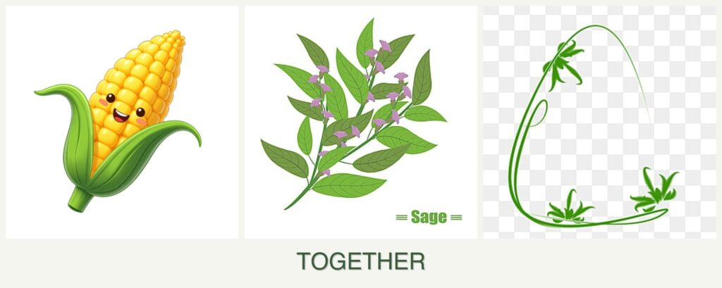 Corn should be planted 12-15 inches apart, while sage needs 18-24 inches. Keep them in separate areas.