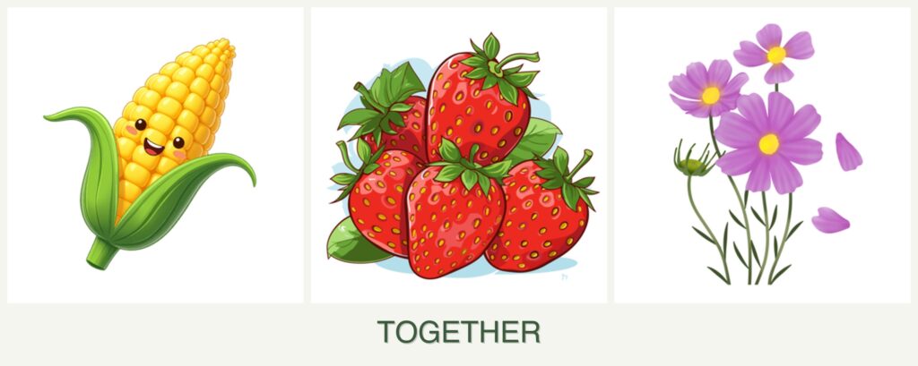 Planting corn, strawberries, and cosmos together offers several benefits: