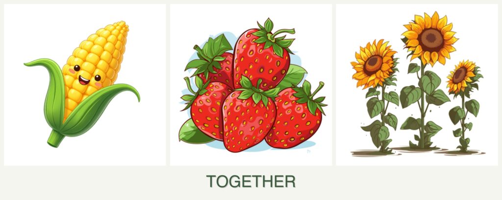 - Improved Growth: Corn provides structural support for sunflowers, and strawberries can benefit from the shade provided by taller plants.