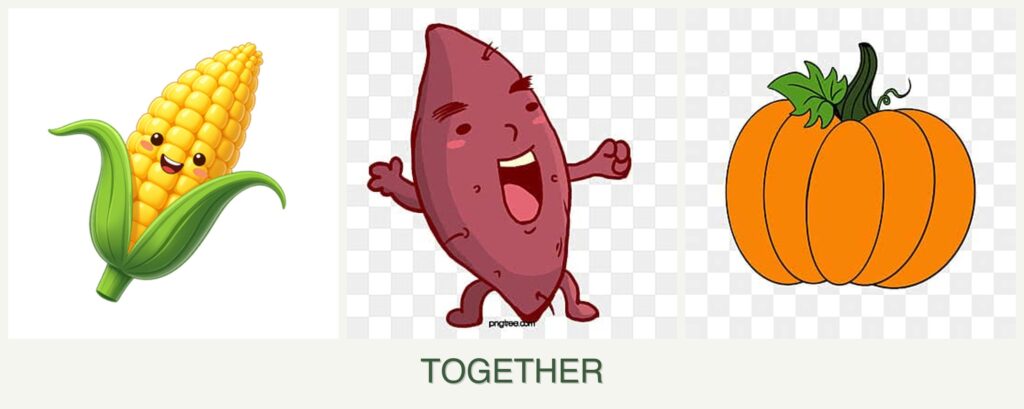 - Space Efficiency: Using vertical and horizontal space efficiently, corn grows upward while pumpkins and sweet potatoes spread out.
