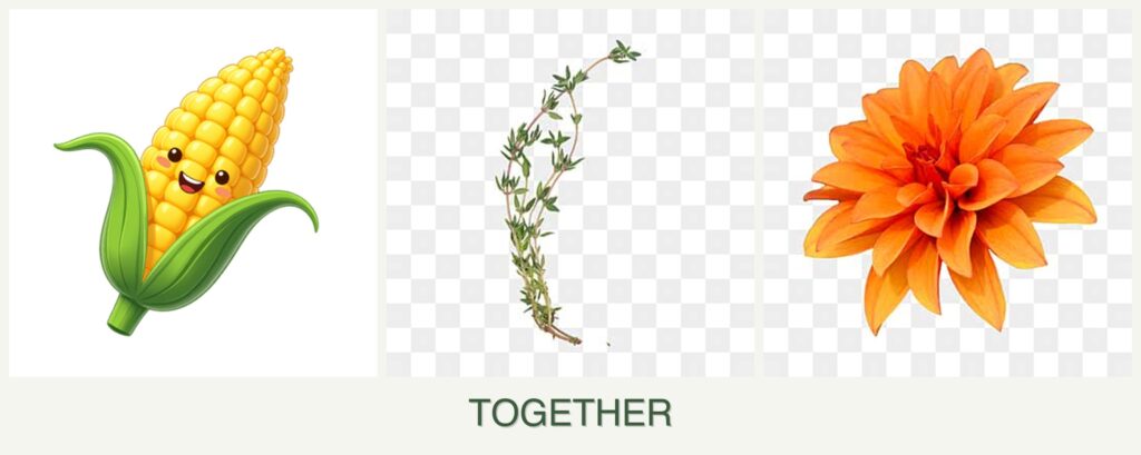 - Timing: Plant corn in early spring, followed by thyme and dahlias once the soil warms.