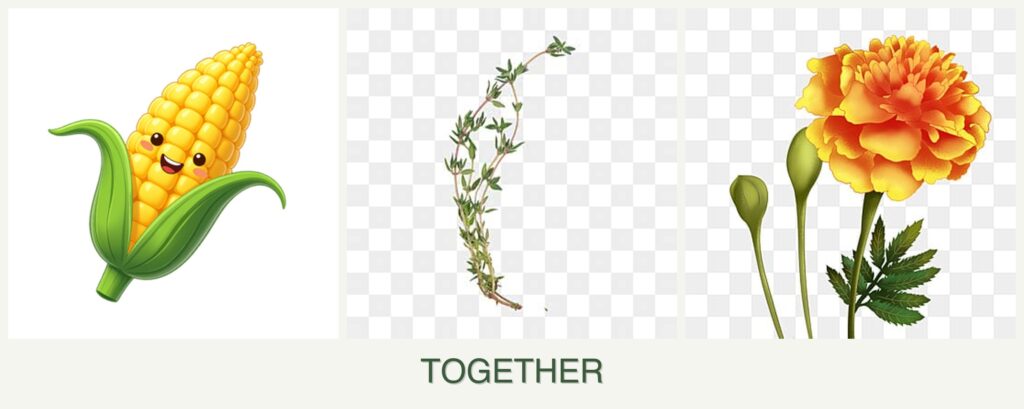 Watering Needs: Corn and marigolds require moderate watering, whereas thyme prefers drier conditions. Adjust watering practices accordingly.