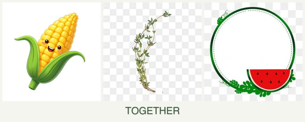 - Growth Requirements: Corn and watermelons need full sun and regular watering, while thyme prefers slightly drier conditions.
