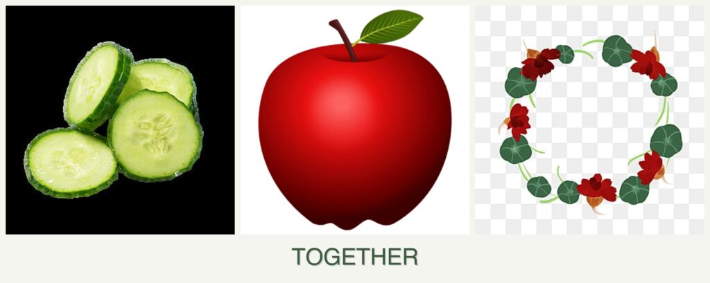 - Growth Requirements: Cucumbers and nasturtiums thrive in similar conditions, while apple trees require more space and time to mature.
