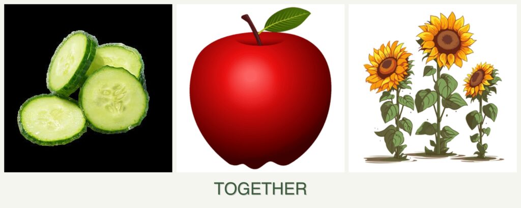 - Growth Requirements: Cucumbers and sunflowers thrive in similar conditions, preferring full sun and well-drained soil. Apples, however, require more space and have different nutrient needs, making them less compatible with the other two.