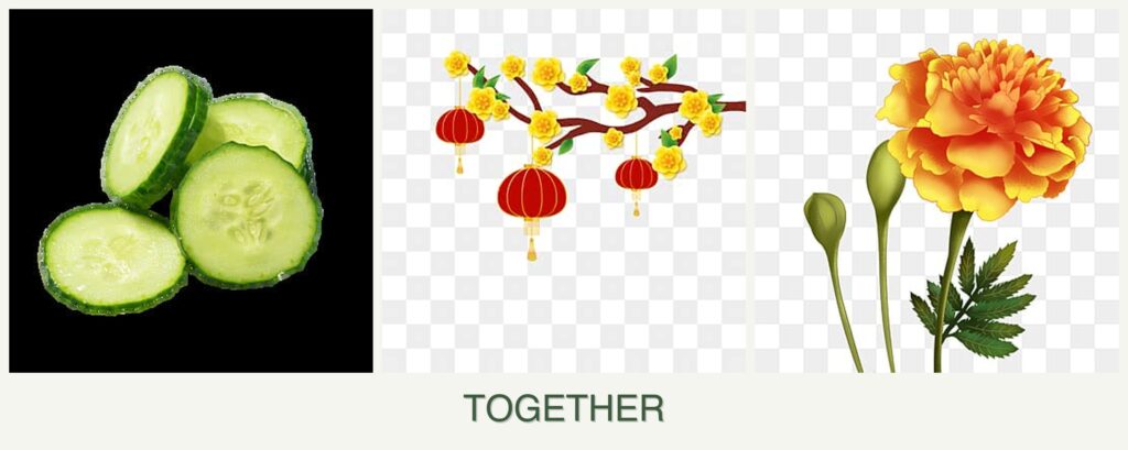 - Do cucumbers and marigolds need the same amount of water? Generally, yes, but monitor soil moisture as marigolds can tolerate drier conditions.
