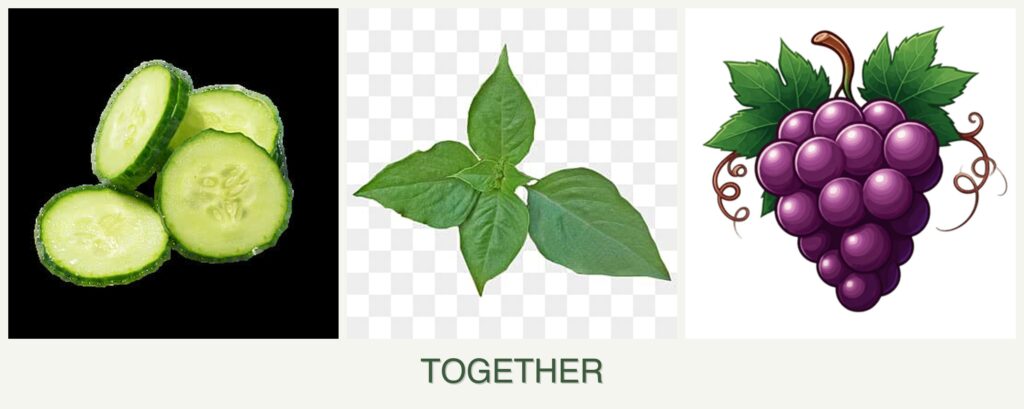 - Pest Control: Basil’s aroma can repel aphids and beetles, protecting cucumbers. Grapes, being woody plants, generally face different pest threats.