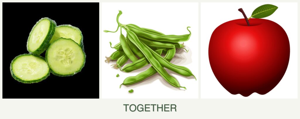 - Growth Requirements: Cucumbers and beans have similar sunlight and water needs, while apples require more space and a different care regimen.