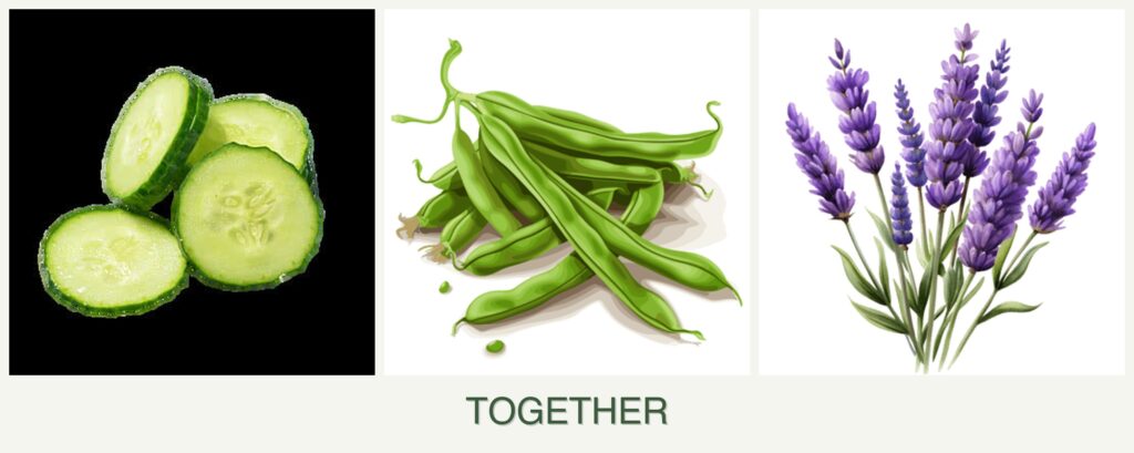 - Pest Control: Beans can help repel pests that affect cucumbers, while lavender attracts beneficial insects.